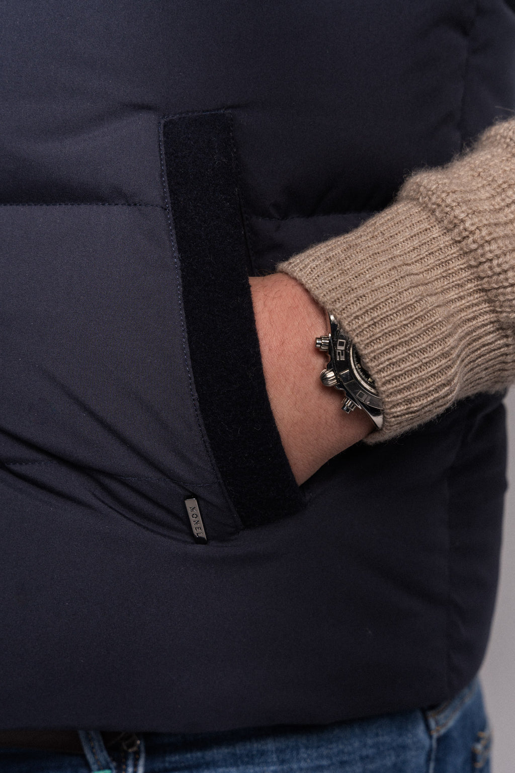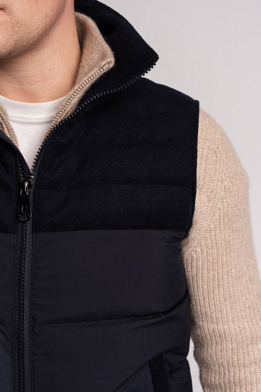 Monel Alex II Down Vest – Marineblå dunvest med stilrent ullpanel øverst. Lett, varm og anvendelig – perfekt alene eller som et lag under jakken.
