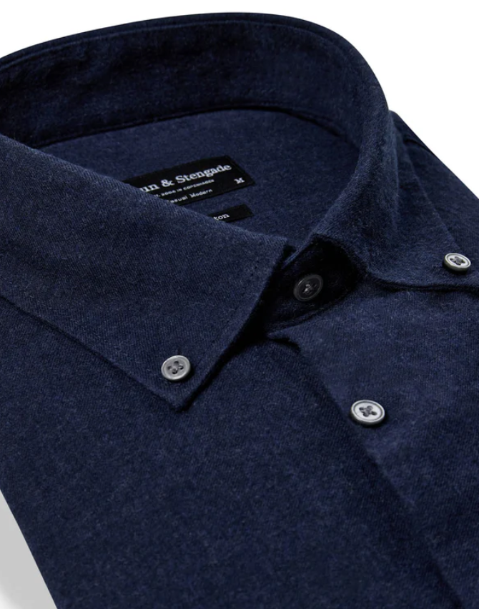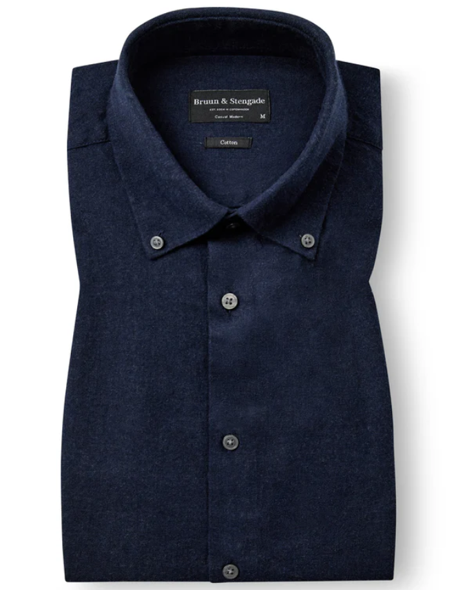 Faruk-skjorte fra Bruun & Stengade – Casual Modern Fit i 100% bomull med børstet overflate. Litt romslig passform, button-down-krage og grå knapper. Tidløs og allsidig.