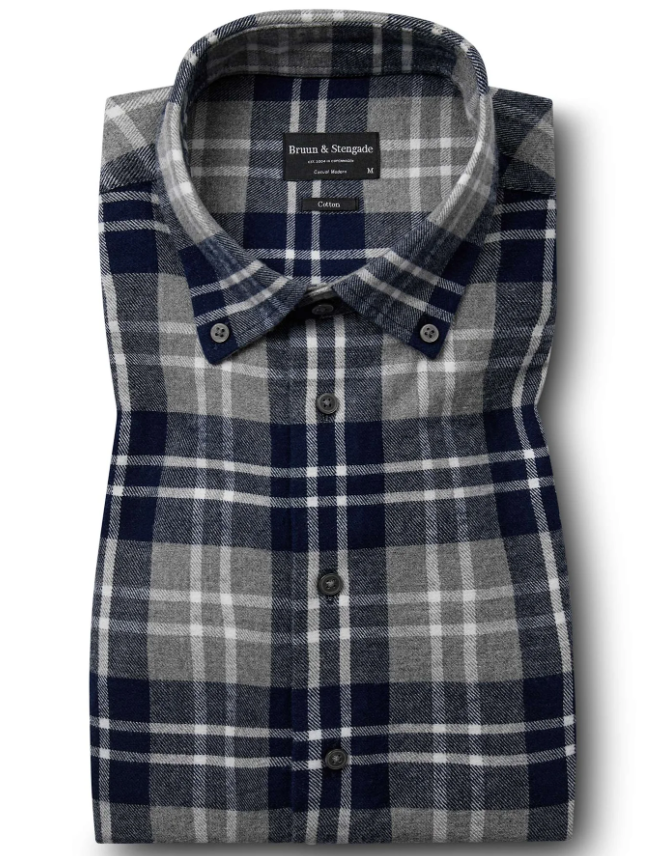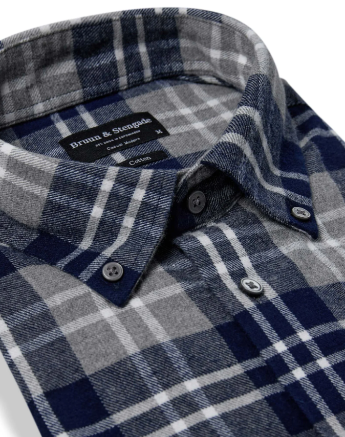 Ravi-skjorte fra Bruun & Stengade – rutete Casual Modern Fit i 100% bomull med børstet overflate. Litt romslig passform, button-down-krage og grå knapper for en avslappet, klassisk stil.