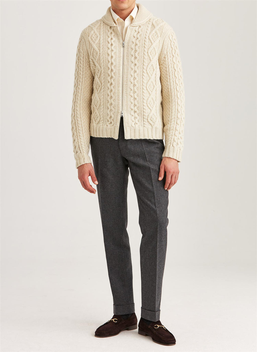 Cornwall Cable Zip Jacket fra Morris henter inspirasjon fra klassiske irske strikketradisjoner, med intrikate flettemønstre som gir et tidløst uttrykk. Strikket i varm og solid ull, holder den deg komfortabel på kjølige dager, mens den moderne glidelåsløsningen gjør den både allsidig og enkel å style. En cardigan med karakter – perfekt til både avslappede helger og mer kledde anledninger.