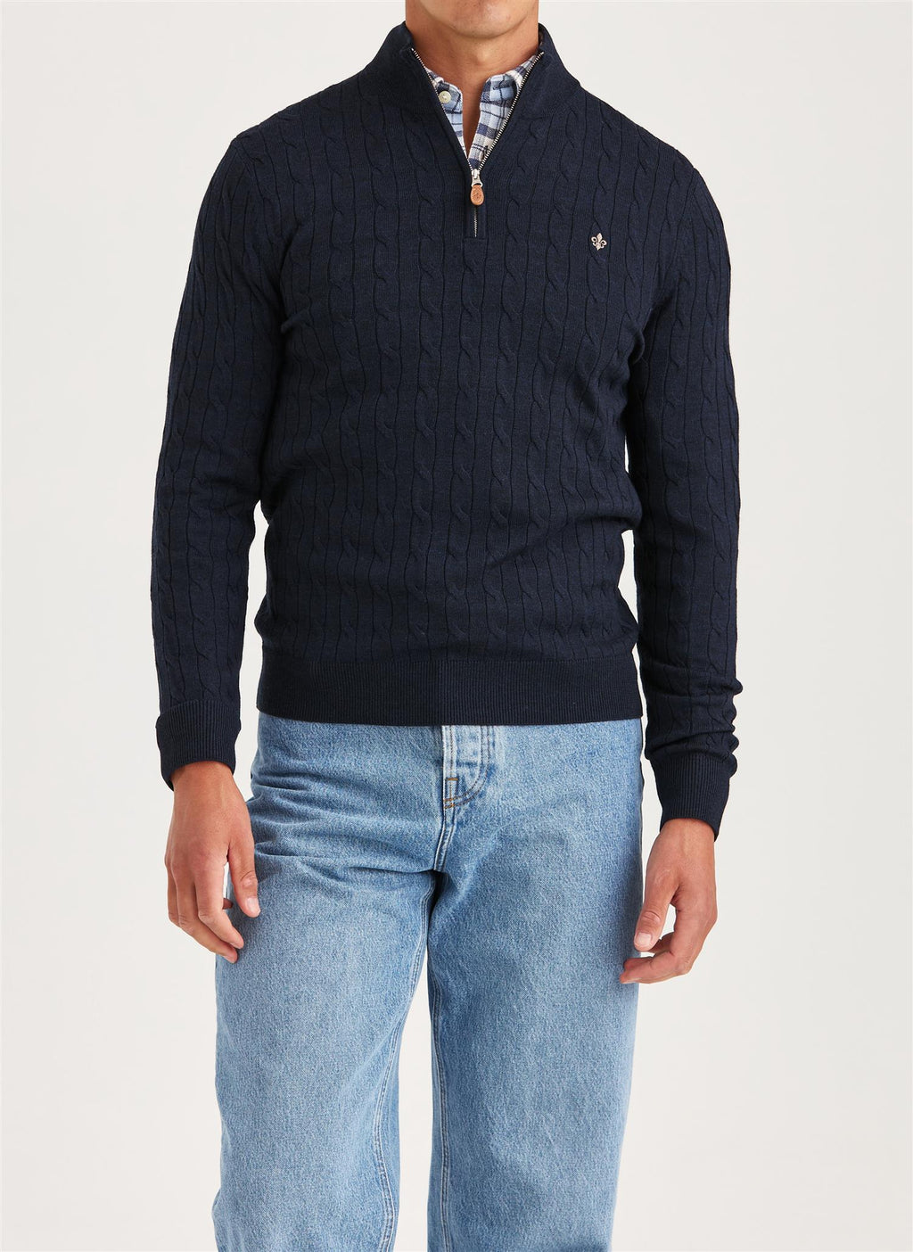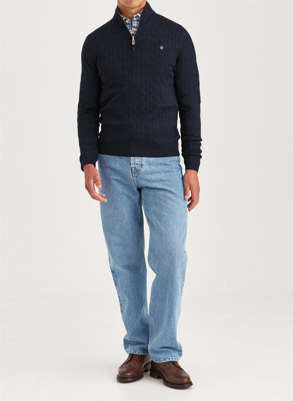 Merino Cable Zip fra Morris kombinerer sporty half-zip med tidløs cable-struktur. Strikket i 100% merinoull som regulerer temperaturen, gir den komfort og stil året rundt. En allsidig genser som passer til enhver garderobe. En klassiker sesong etter sesong.