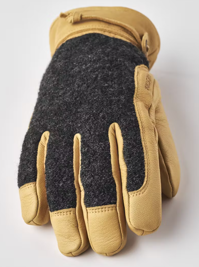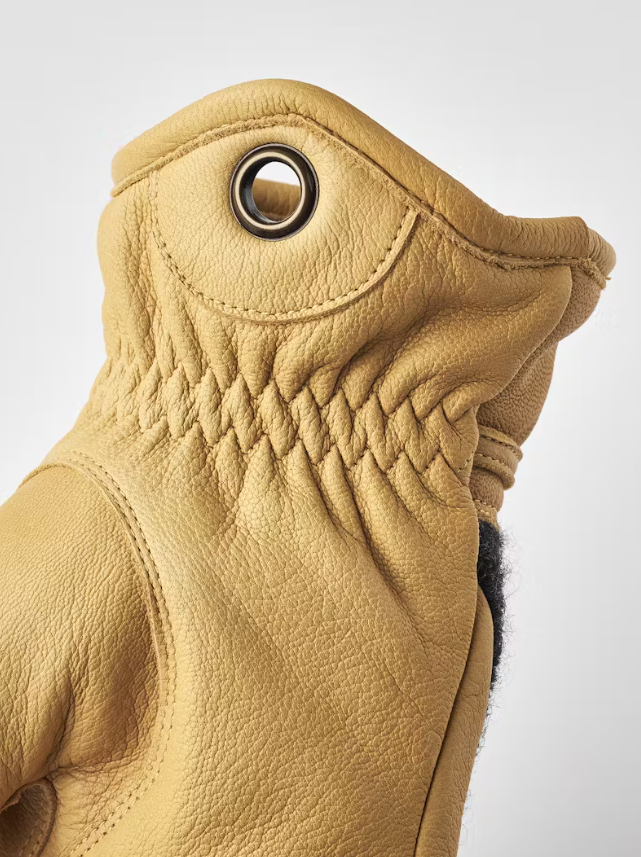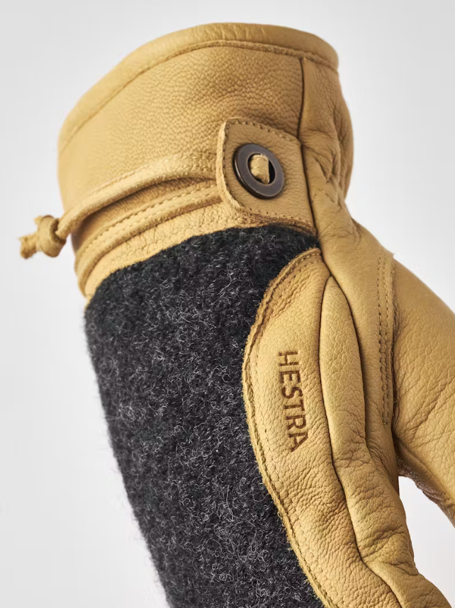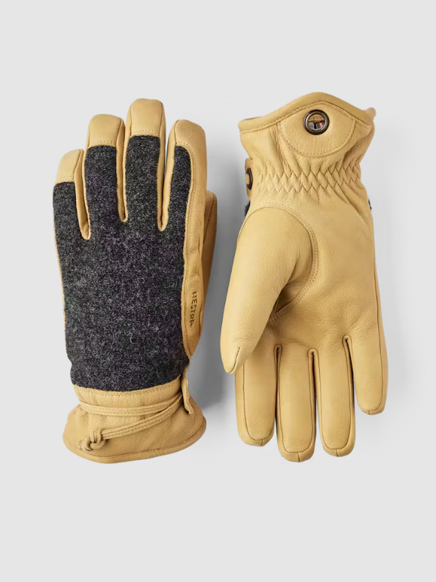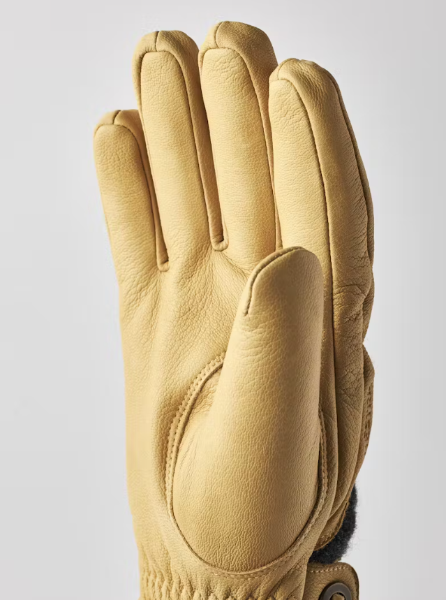 Tidløs 5-fingers hanske fra Hestra i mykt skinn, med knyting over håndleddet og ullfôr på oversiden. Komfortabel, varm og med en frisk gul farge som gir personlig preg.