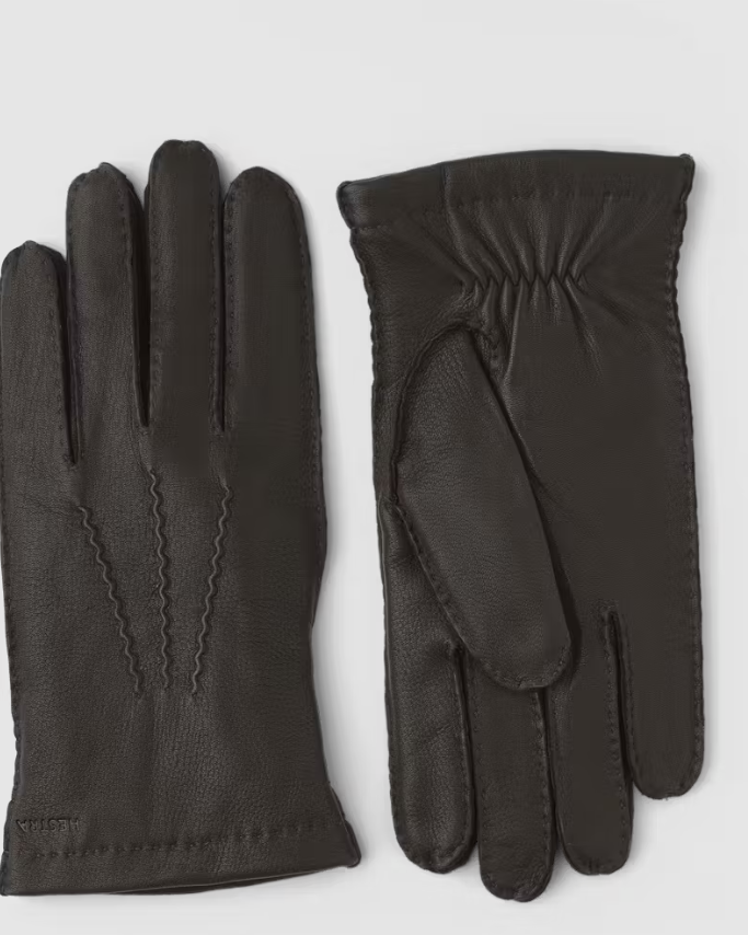 Varm og tidløs herrehanske fra Hestra, håndsydd i mykt hjorteskinn med naturlig, rustikk finish. Strikket ullfôr holder hendene komfortabelt varme, mens det klassiske designet passer like godt i byen som ute på landet.